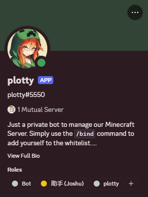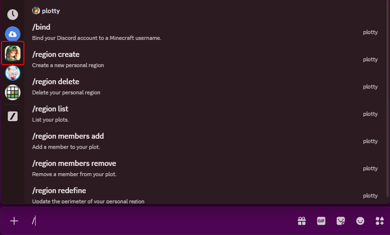 Plotty ist ein selbstgeschriebener Discord-Bot, welcher genutzt werden kann um sich direkt über Discord auf dem Server zu Whitelisten oder um sich ein Grundstück via WorldGuard zu registrieren und zu managen.