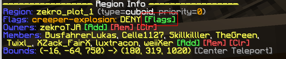 Gibt eine interaktive Chat-Nachricht mit Informationen über das Grundstück, in dem man sich gerade befindet. Mit einem Klick auf [Flags] kann man verschiedene Flags auf seinem eigenen Grundstück setzen, wie z.B. creeper-explosion, welches das Explodieren von Creepern verhindert.